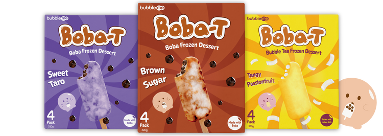 A twist on traditional bubble tea, Boba-T is a frozen dessert with mouth-watering flavours of Brown Sugar, Sweet Taro and Tangy Passionfruit, bursting with boba pearls or lychee jelly. A new indulgence that's deliciously different!